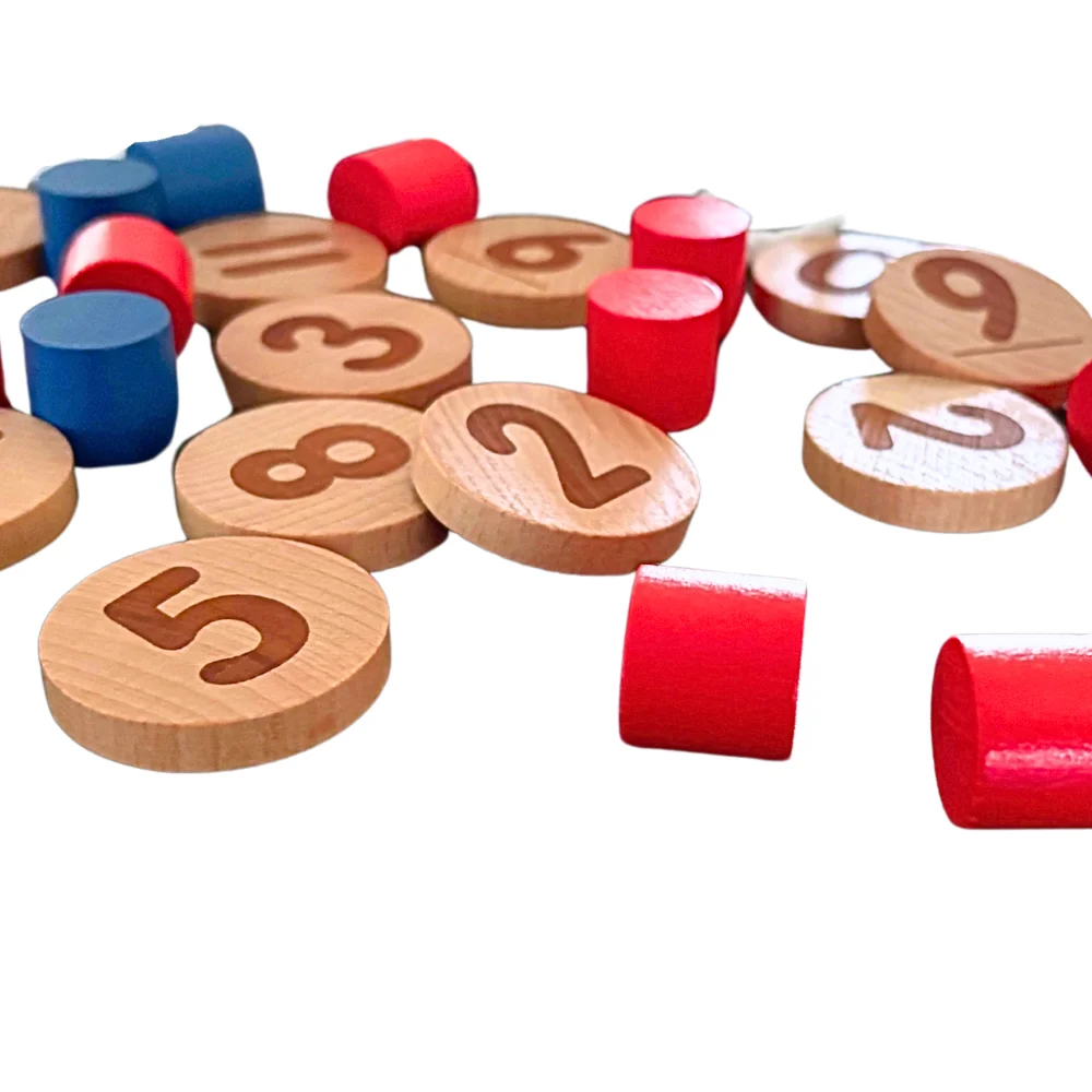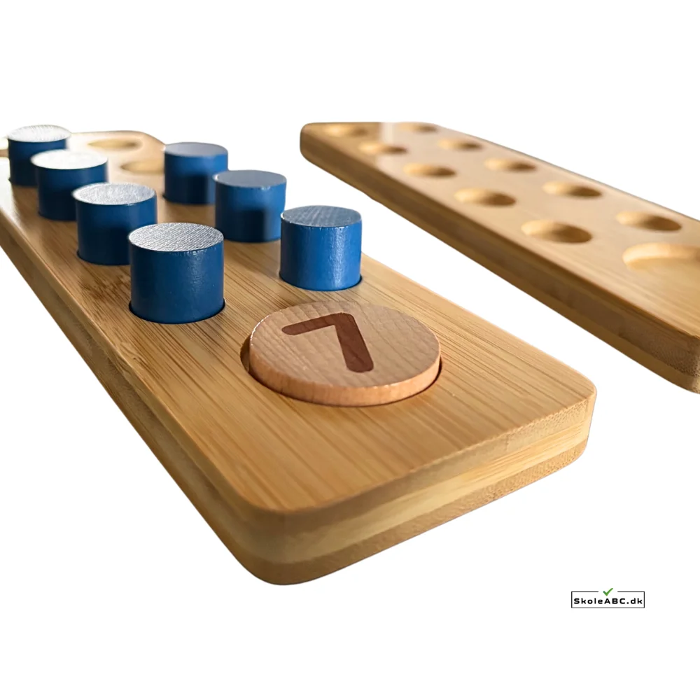 Med dette træspil arbejder børnene praktisk og kropsligt med matematik. De placerer en talbrik (1-10) for enden af pladen og anvender røde og blå figurer til at illustrere mængden. Det styrker både deres mængdeforståelse og deres begreb om titalssystemet. Materialet er i tråd med både Montessori-pædagogikken og Steiners læringssyn, hvor læring opstår gennem konkret erfaring og sansning.