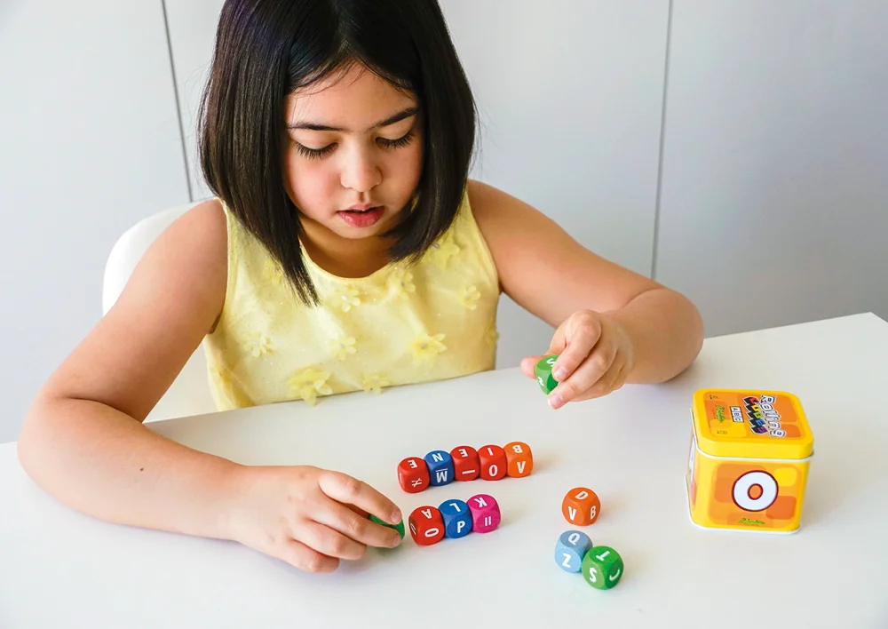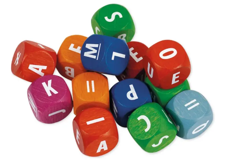 Hver terning præsenterer bogstaver i hvidt på en baggrund af seks forskellige farver. Røde terninger markerer vokalerne, hvilket gør det nemt for børn at skelne mellem vokaler og konsonanter.