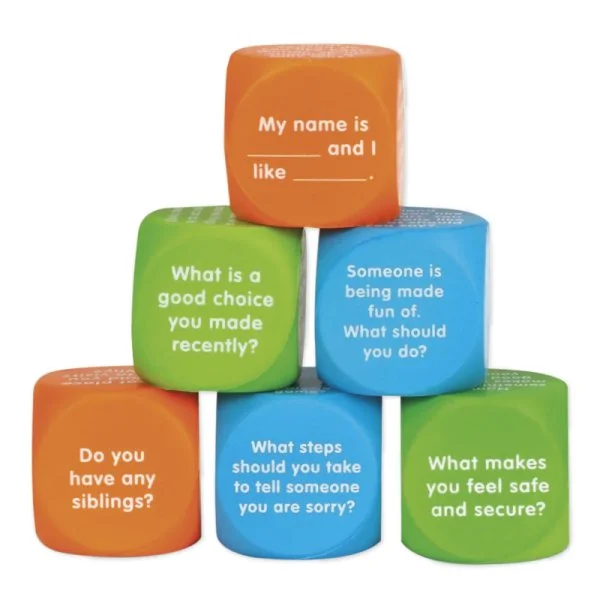 Med 36 forskellige spørgsmål og udfyldningssætninger opdelt i tre kategorier, opmuntrer disse terninger børn til at udtrykke sig, dele og lære på engelsk: