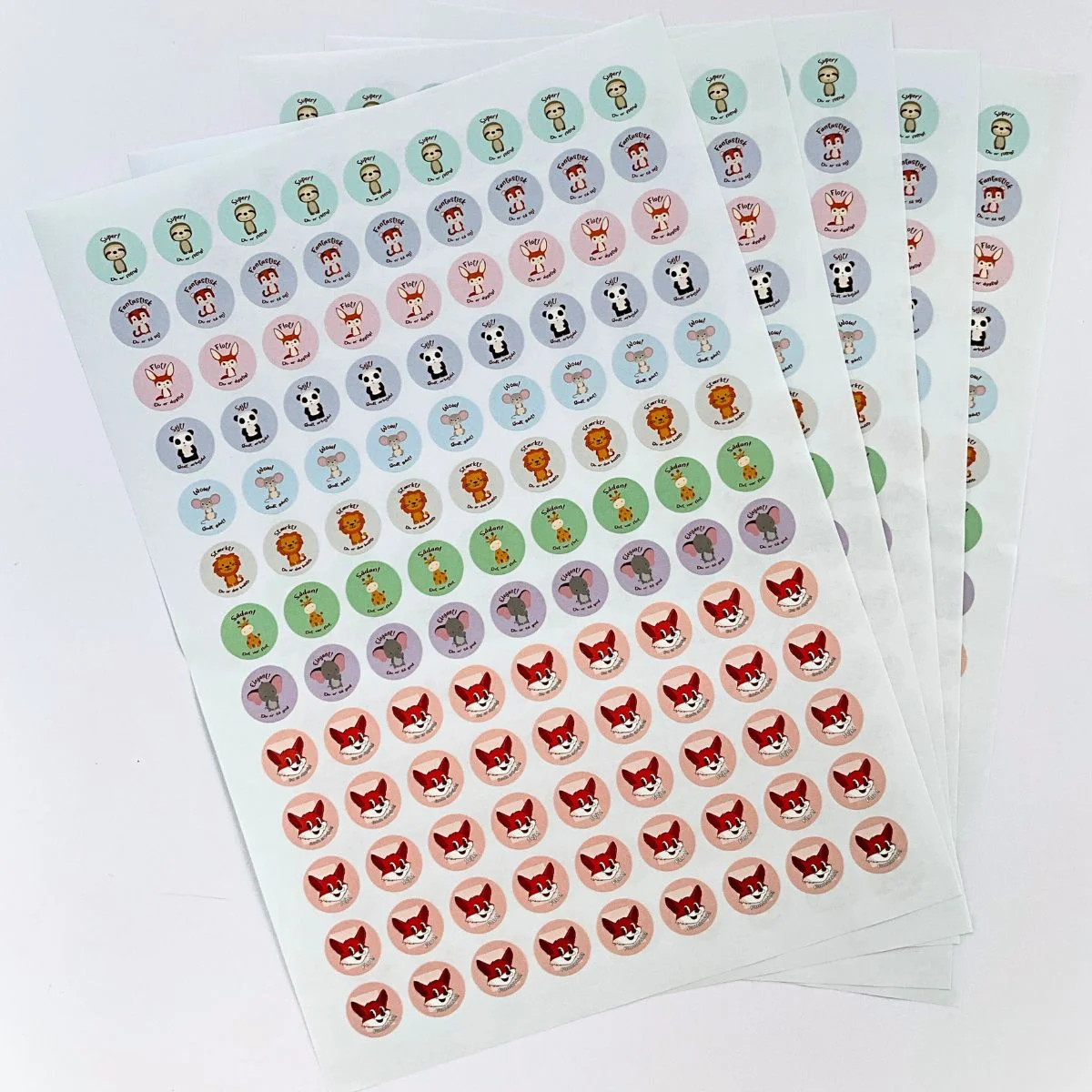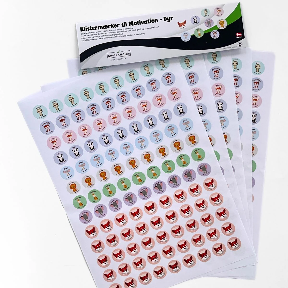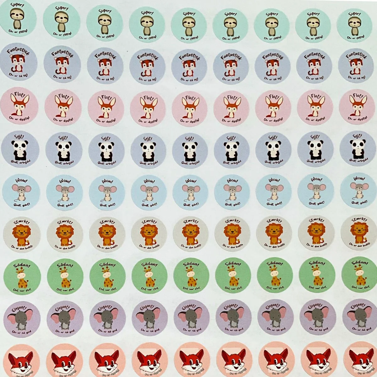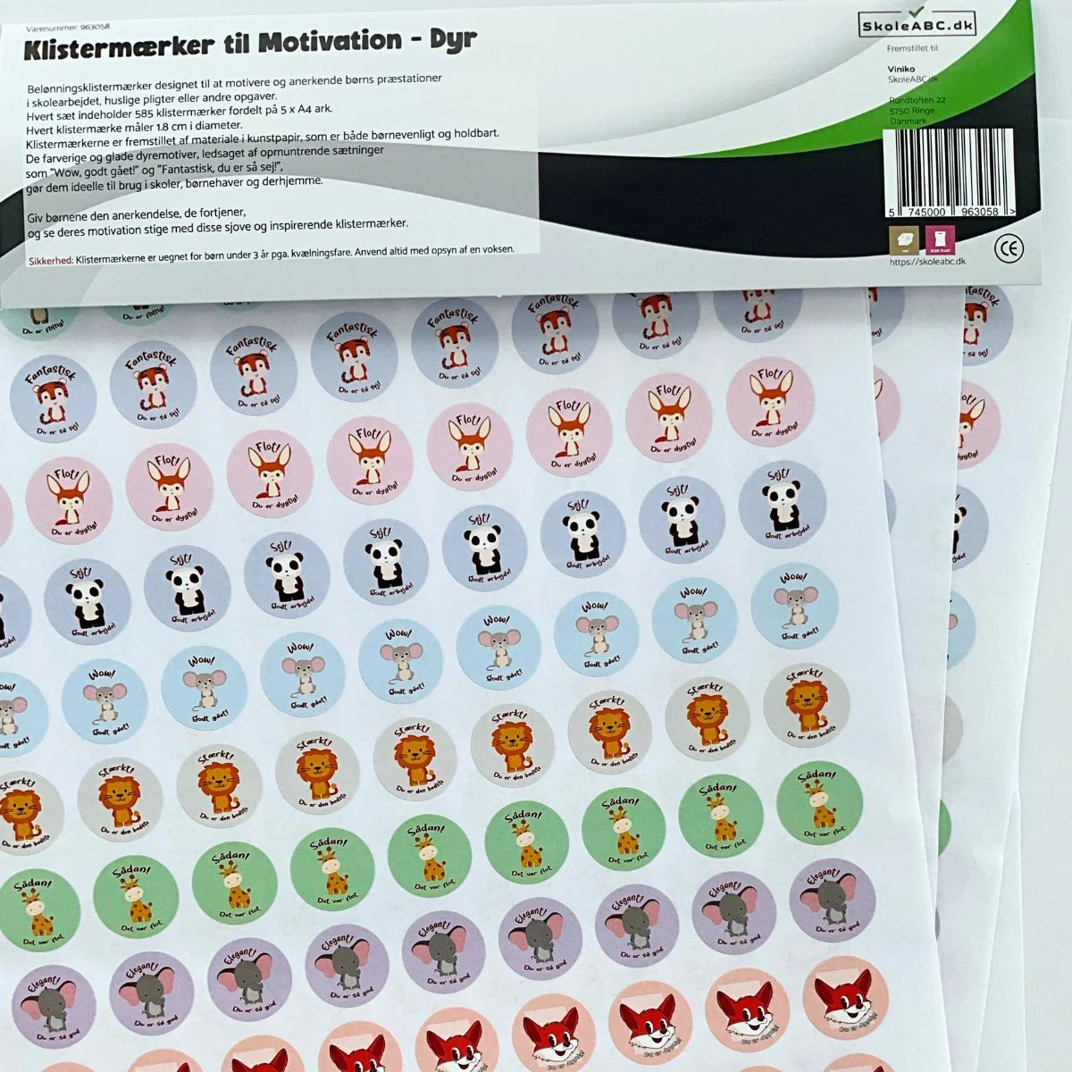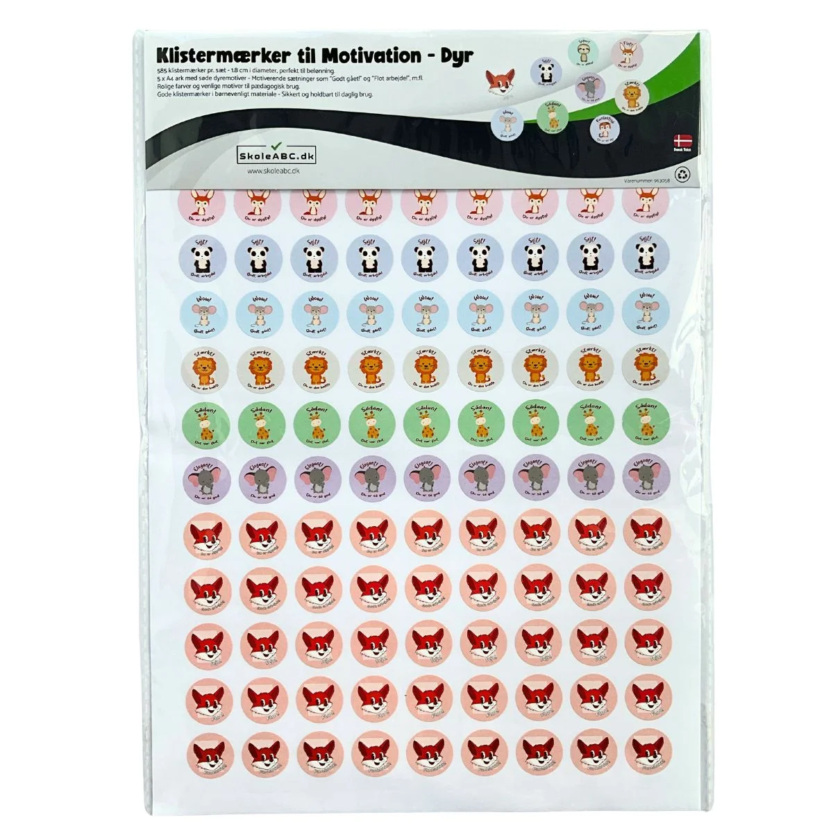 Hvert sæt indeholder 585 klistermærker, som er 1.8 cm i diameter, perfekt til belønning og anerkendelse. Klistermærkerne kommer i 5 x A4 ark med søde dyremotiver, som har motiverende sætninger som “Godt gået!” og “Flot arbejde!”, blandt mange andre. Farverne er rolige og motiverne venlige, hvilket gør dem ideelle til pædagogisk brug.