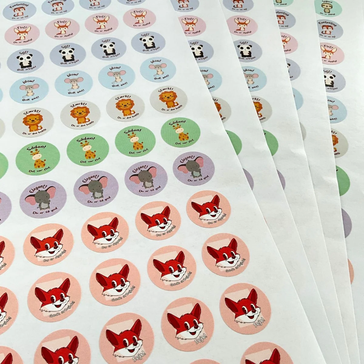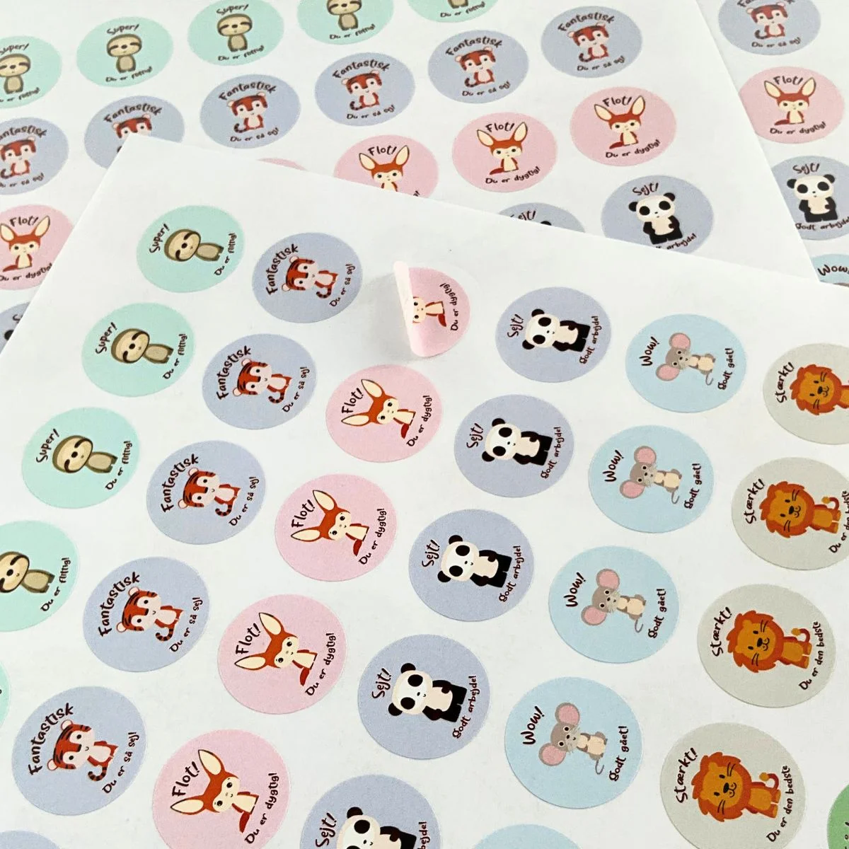 Klistermærkerne er lavet af kunstpapir, som er både børnevenligt og holdbart. Det betyder, at de kan modstå daglig brug uden at miste deres kvalitet. De farverige og glade dyremotiver, ledsaget af opmuntrende sætninger, gør dem perfekte til brug i skoler, børnehaver og hjemme.