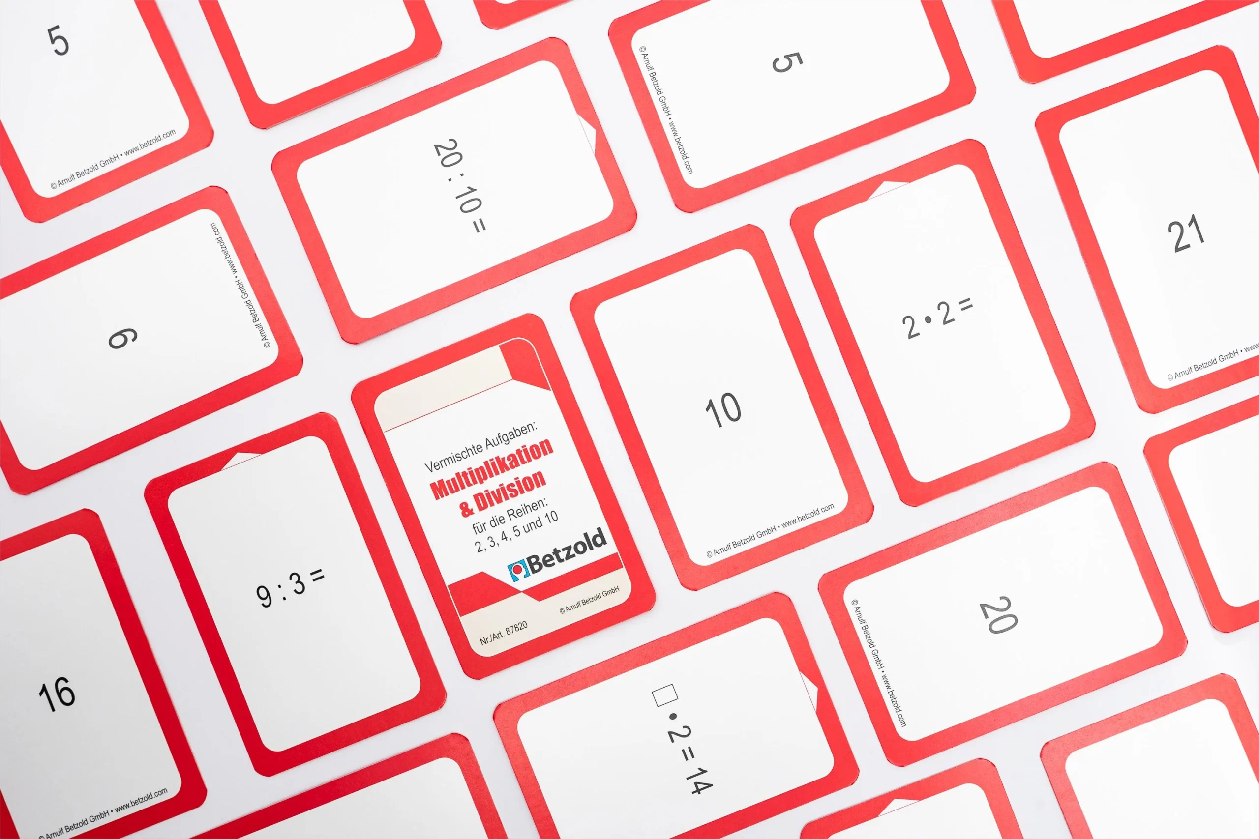 - 48 farvekort trykt på begge sider, hver med en unik multiplikation eller divisionsopgave.