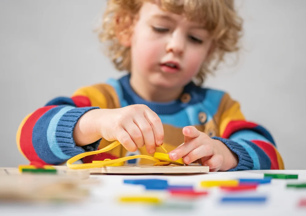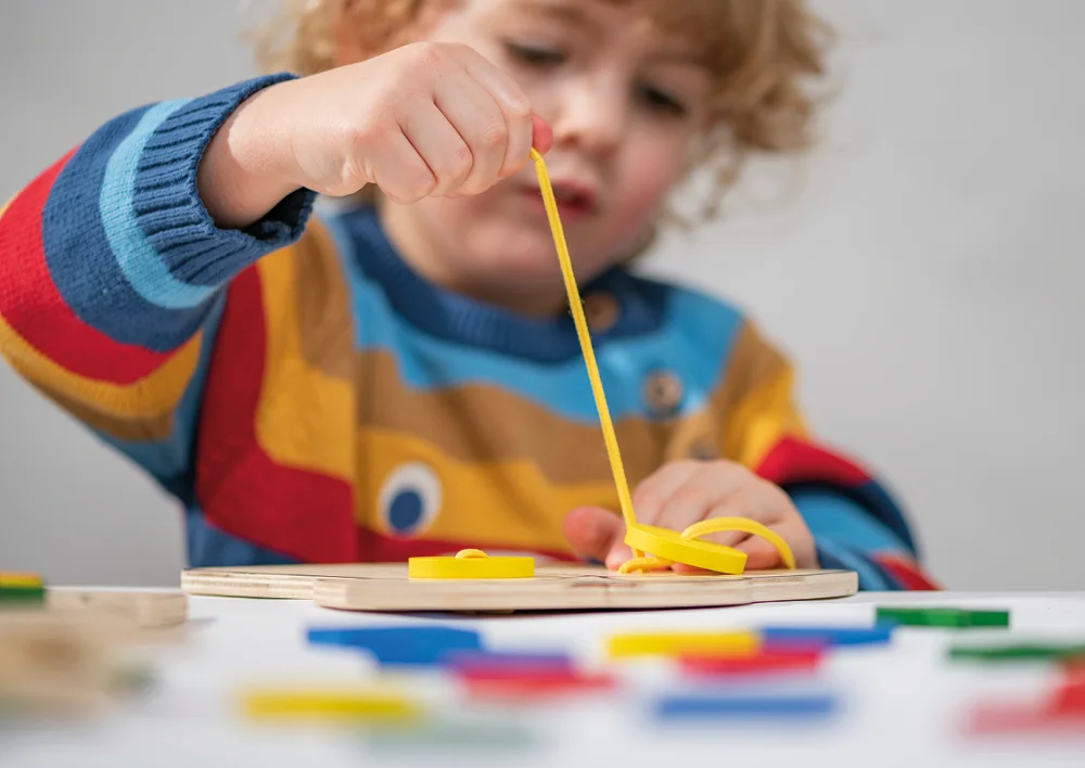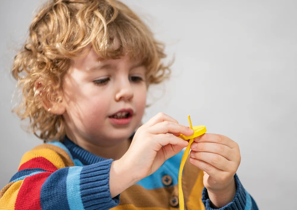 De 8 farverige trådsnore og 32 store træknapper i 4 forskellige farver og former gør det til en spændende og lærerig oplevelse. De medfølgende vejledningskort hjælper med at placere knapperne korrekt, hvor den farvede kant på kortene angiver sværhedsgraden.