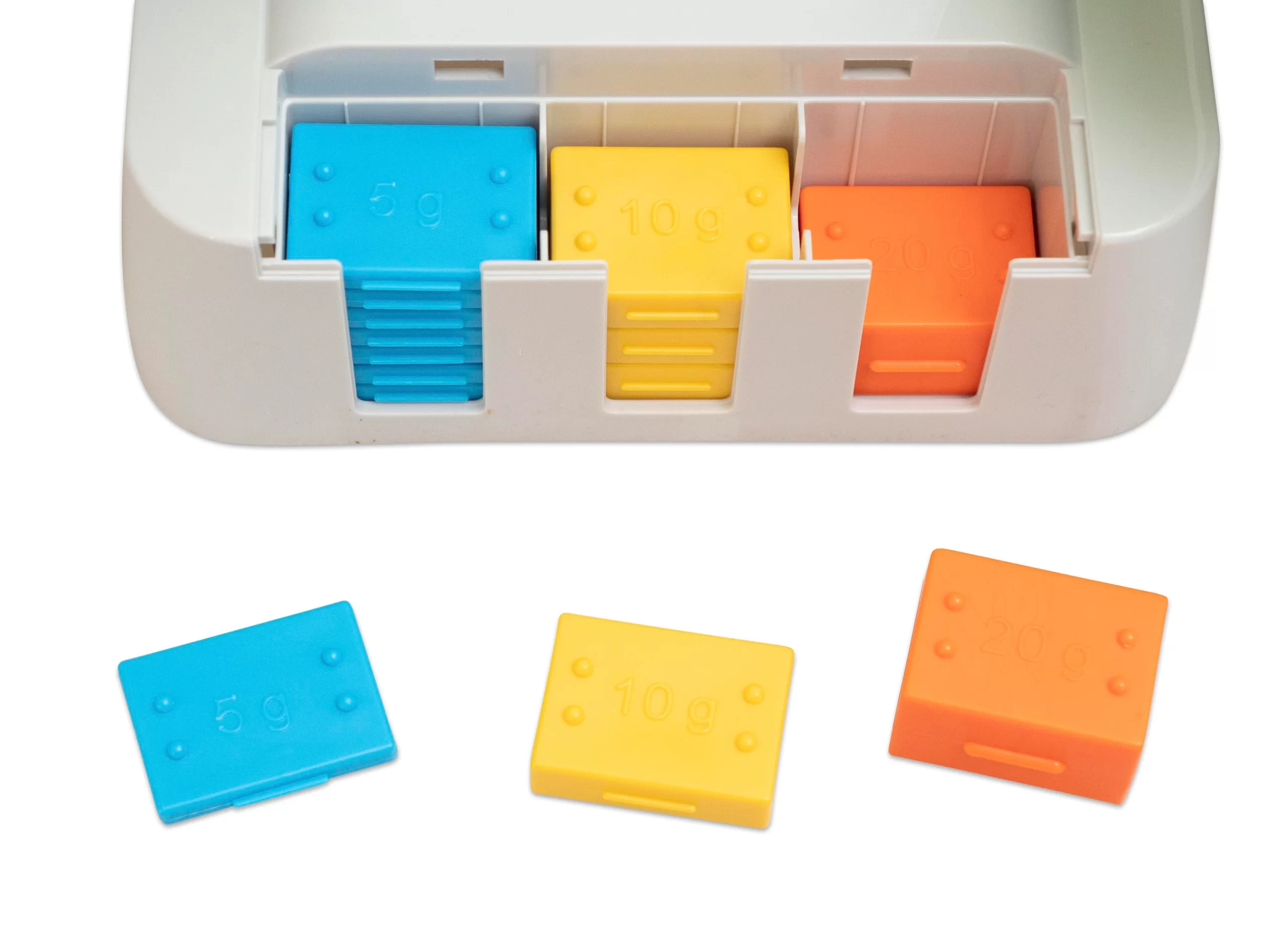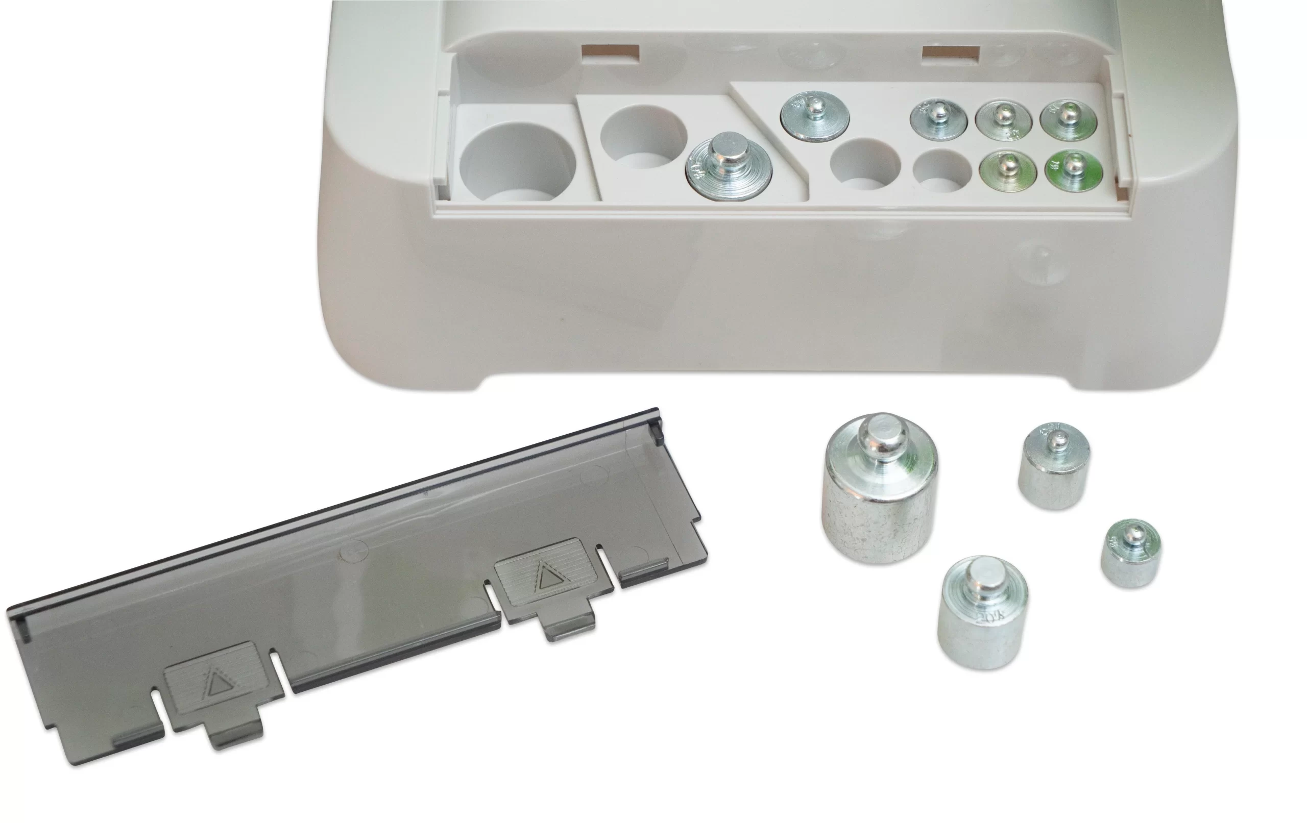 - Integreret opbevaring for to sæt vægte (metal og plastik) i vægtens fod.