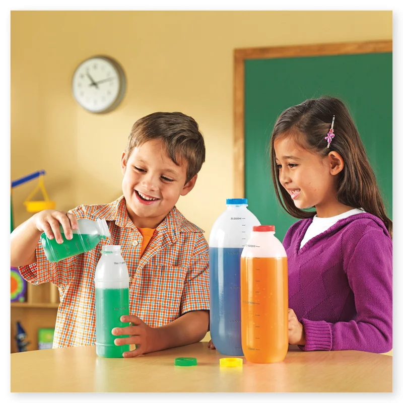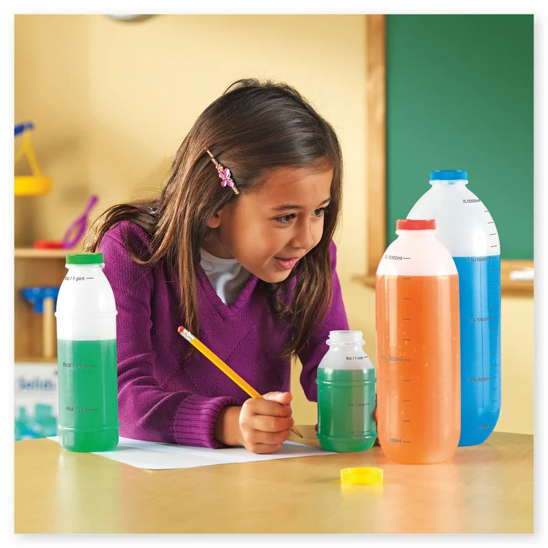 Med dette måleflaskesæt kan eleverne udforske spørgsmål som: “Hvor meget vand svarer til et halvt kilo sne?” eller “Hvad er vægten af 500 ml vand?” Det gør dem perfekte til undervisning i måleenheder og dagligdags matematik såsom brøker (1, 1/2, 1/4 osv.).