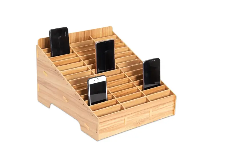 Denne mobilkasse bidrager til en rolig og uforstyrret undervisning. Opbevar op til 45 smartphones sikkert med passende afstand til hinanden. Den stabile mobilkasse er lavet af MDF og er ideel til klasseværelser og eksamenslokaler. De enkelte dele kan nemt samles og fastgøres med plastikclips.