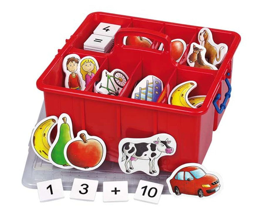 Med sjove og farverige billeder bliver matematik en leg. Praktisk matematik kasse til let opbevaring.