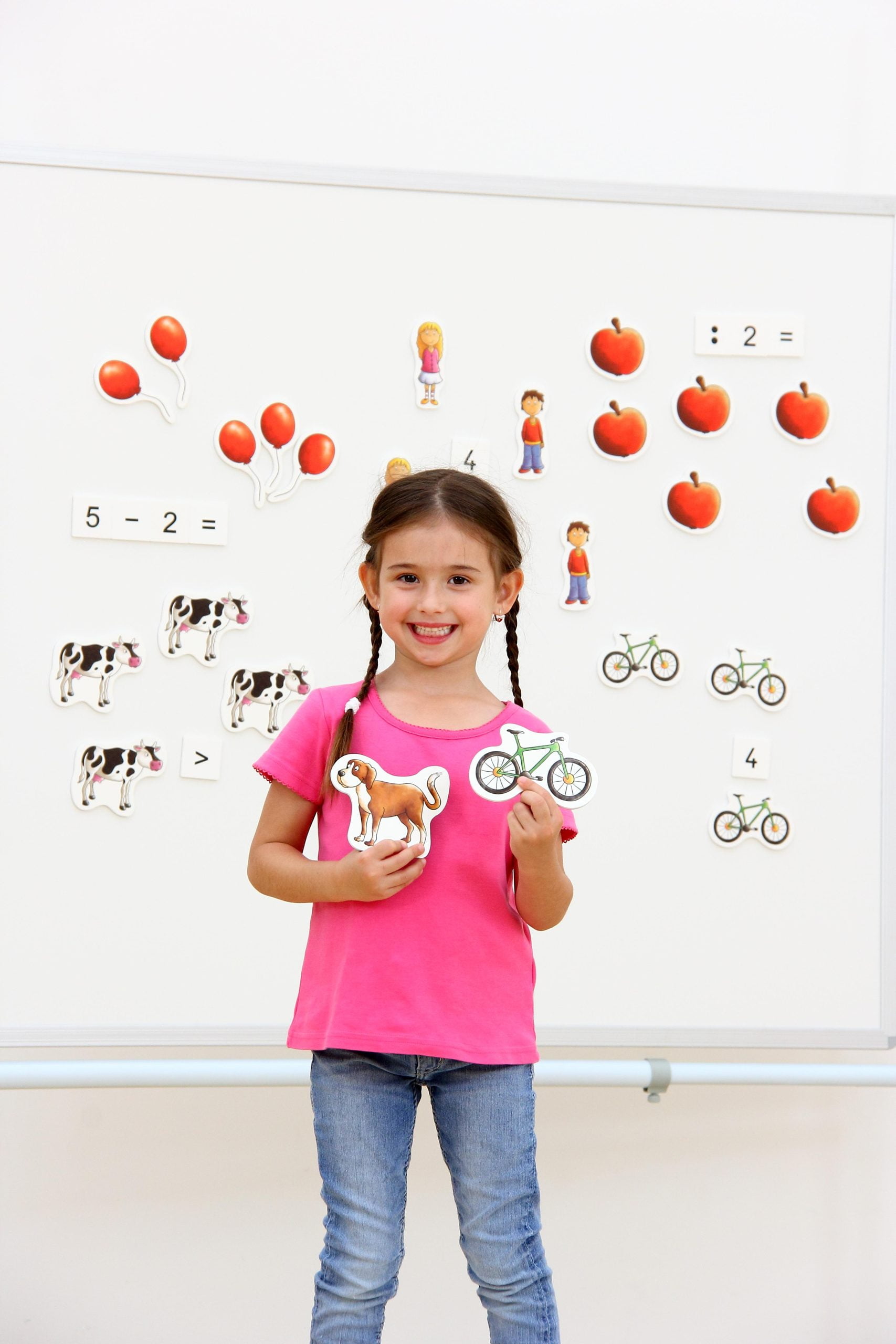 Magnetisk matematikleg. Børnevenlige magnetbilleder i praktisk matematik kasse til undervisning i skole og børnehave.