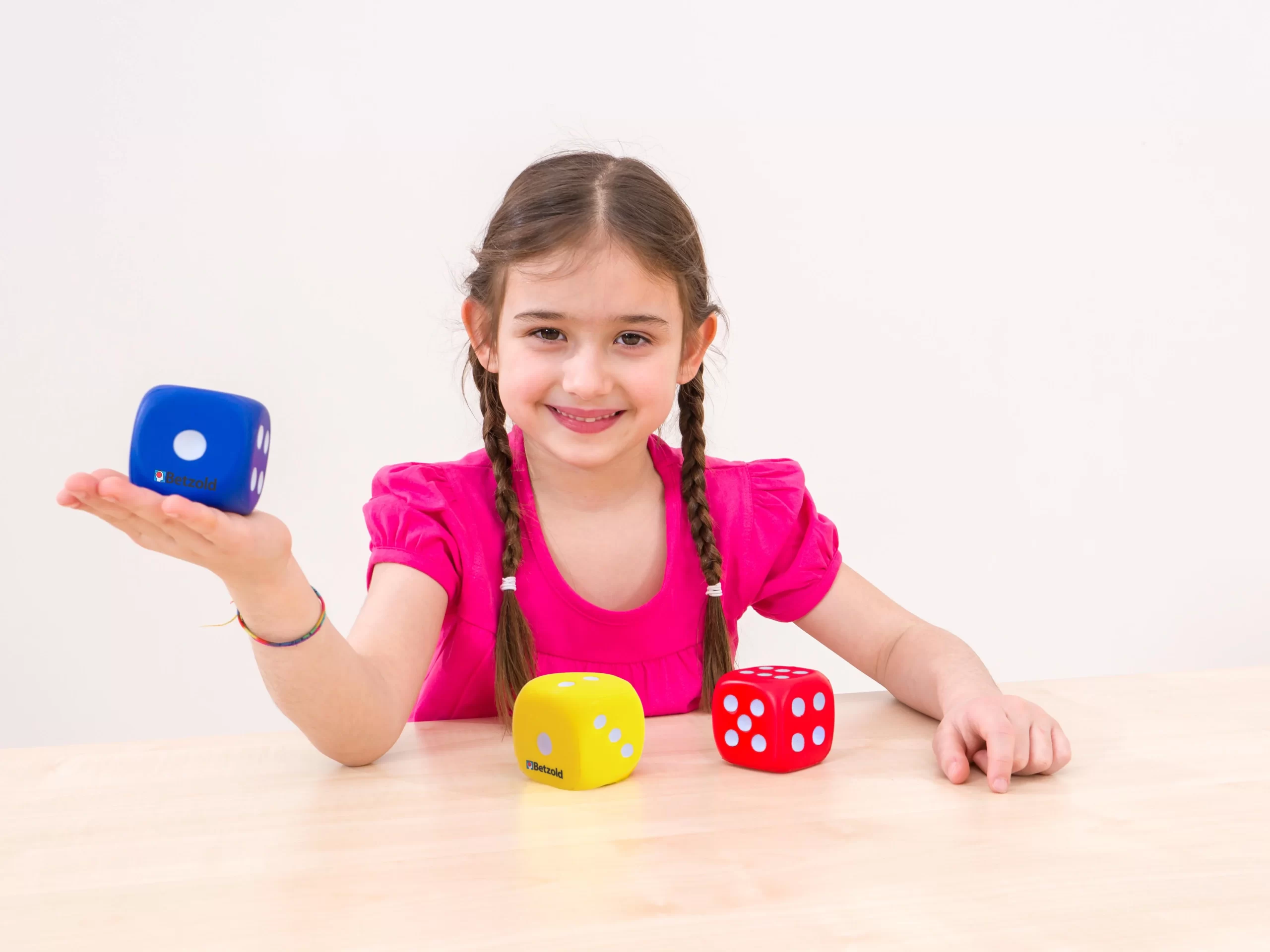 De tre skumterninger er dækket af en fleksibel belægning, der beskytter skummet. Dette gør det muligt for børnene at kaste terningerne på bordet uden at lave støj. De store og farverige øjne på terningerne gør det nemt for børnene at aflæse resultaterne. Med en kantenlængde på 5 cm er terningerne perfekt til små hænder. Selv når hele klassen kaster terningerne samtidig, vil der ikke være nogen generende støj. Dette reducerer støjniveauet betydeligt. De iøjnefaldende farver gør det nemt at finde terninger, der måtte blive væk.