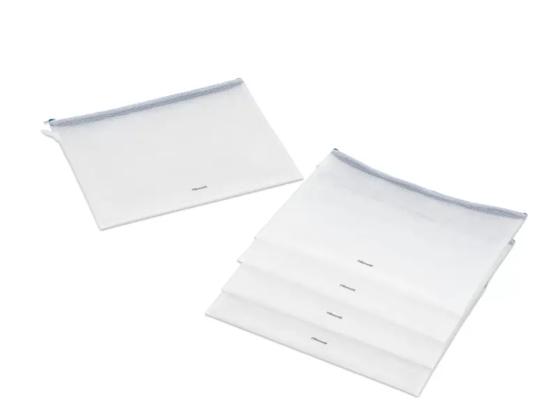 Hver pose måler 210 x 297 mm, hvilket passer perfekt til A4-størrelse, og kommer med en praktisk tekstil lynlås med metalglider, der sikrer let åbning og lukning. De er yderst holdbare med en tykkelse på 150 my (µ), og den fiberforstærkede struktur giver ekstra beskyttelse mod rive og slid.
