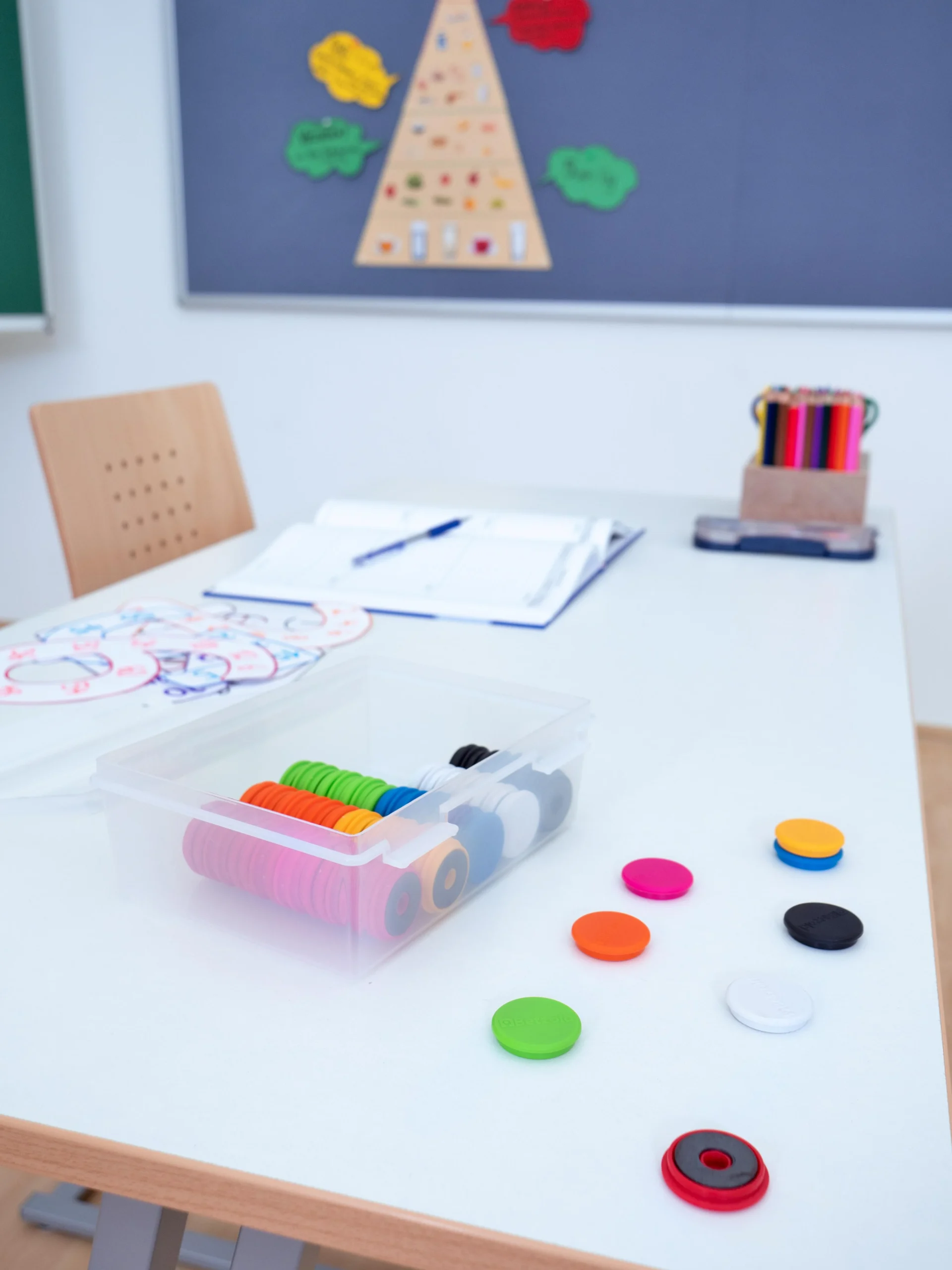 Gør organisering, undervisning og hverdagsplanlægning både nemmere og mere farverig med dette praktiske sæt tavlemagneter. Her får du 40 stærke magneter i fire klare farver – gul, blå, grøn og rød – som gør det enkelt at skabe overblik og arbejde visuelt. Tavlemagneterne måler 3 cm i diameter, hvilket giver et godt greb og gør dem lette at håndtere for både voksne og børn i indskolingen.