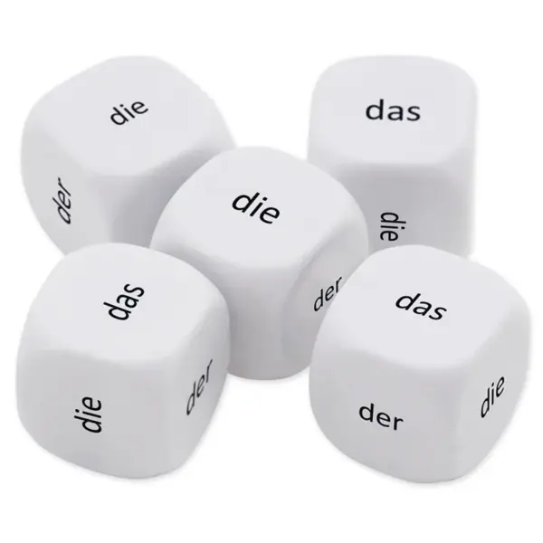 Dette Terningesæt Tysk “Bestemte Artikler” er designet til børn i mellemtrinnet og udskolingen, der lærer tysk. Sættet består af 5 terninger, som hver viser de bestemte artikler: der, die og das. Terningerne er fremstillet af holdbart, hvidt plastik med sorte, indgraverede bogstaver og afrundede kanter. De er ideelle til brug i tyskundervisningen, hvor eleverne kan øve sig på korrekt brug af de bestemte artikler i sjove og interaktive aktiviteter.