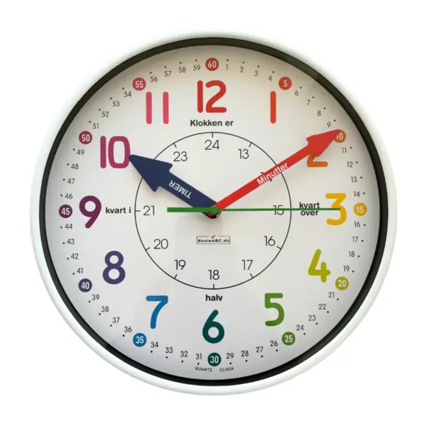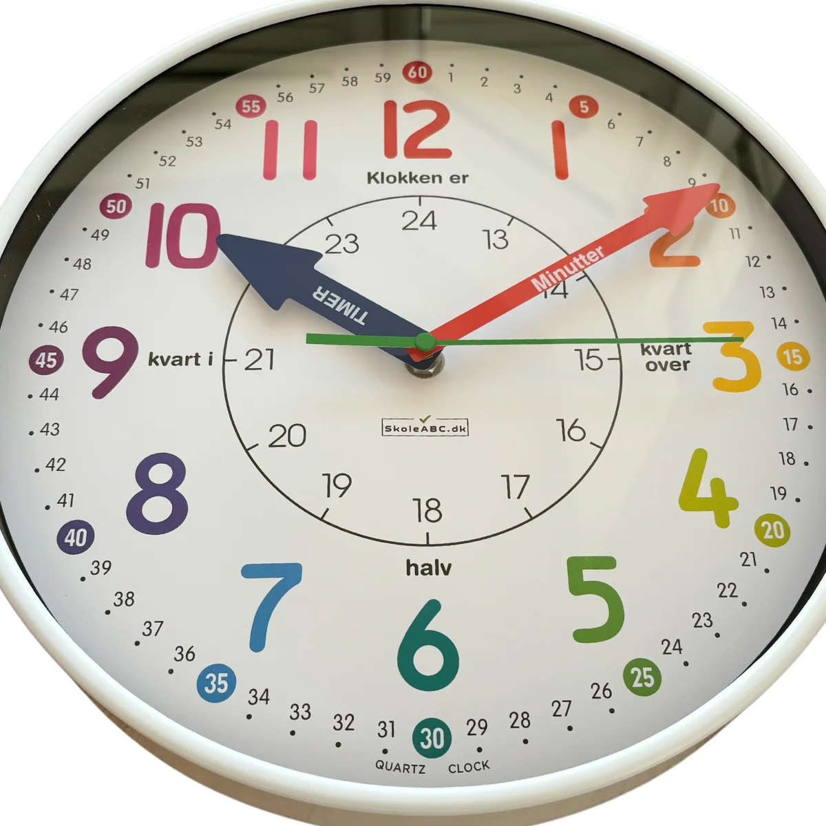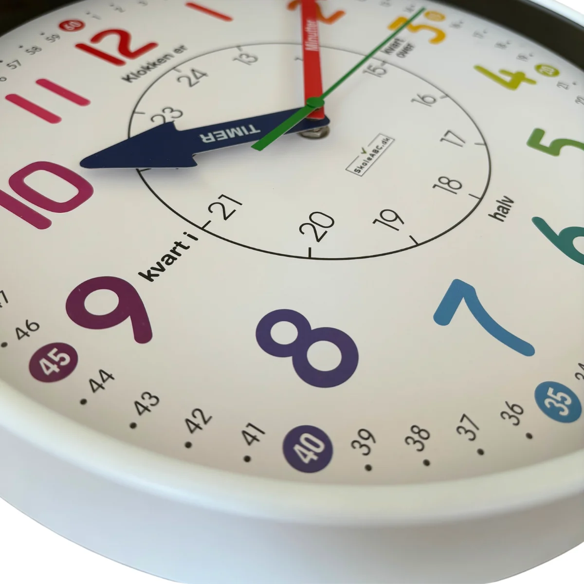 Hos SkoleABC.dk har vi skabt en ny udgave af vores populære læringsur, der er specielt designet til børn. Dette vægur er både funktionelt og æstetisk, og dets minimalistiske design kombineret med farverige detaljer gør det til et ideelt læringsredskab for børn i alle aldre. Vores ur er ikke kun et dekorativt element, men også en aktiv støtte i børns læring af klokken.